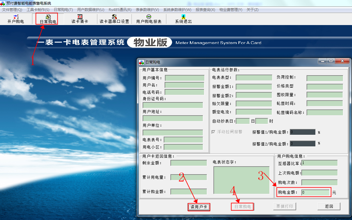 重新插張新卡到讀卡器,以上信息都根據(jù)自己要求設置好之后,單擊“開戶購電”。出現(xiàn)以下畫面。